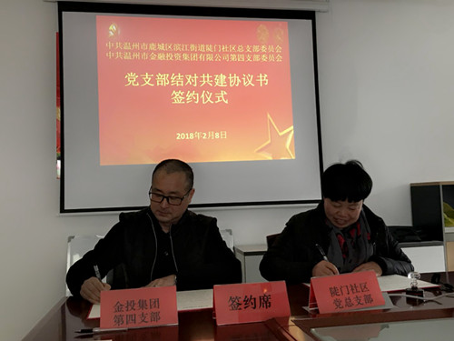 為加強國有企業(yè)基層黨組織與社區(qū)黨組織的聯(lián)系,共同推進城市社區(qū)和國企黨建工作。2月8日下午,溫州市金投集團第四黨支部與濱江街道陡門社區(qū)黨總支部舉行結對共建簽約儀式,簽訂共建協(xié)議書。雙方將通過宣傳教育、文明交通、環(huán)境秩序、公益活動等開展共建互動。...