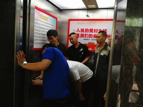 ??? 此次應(yīng)急救援預(yù)案演練模擬在金投商務(wù)樓,模擬一部電梯突發(fā)故障,有兩名乘客被困,被困乘客用電梯內(nèi)的緊急呼叫裝置求救。大樓消控室接到求救信號后,值班人員迅速啟動應(yīng)急救援預(yù)案,并對被困人員進行心理安撫和情緒疏導(dǎo),及時了解電梯內(nèi)的相關(guān)情況。