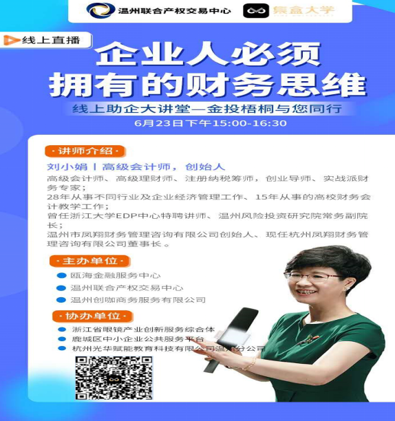 本次活動邀請有15年高校財務(wù)會計教學(xué)經(jīng)驗(yàn)、曾任浙江大學(xué)EDP中心特聘講師、溫州風(fēng)險投資研究院常務(wù)副院長、溫州市鳳翔財務(wù)管理咨詢有限公司創(chuàng)始人劉小娟老師作為嘉賓,通過線上直播的形式,為溫州地區(qū)數(shù)百家企業(yè)講授以《企業(yè)人必須擁有的財務(wù)思維》為主題的課程。